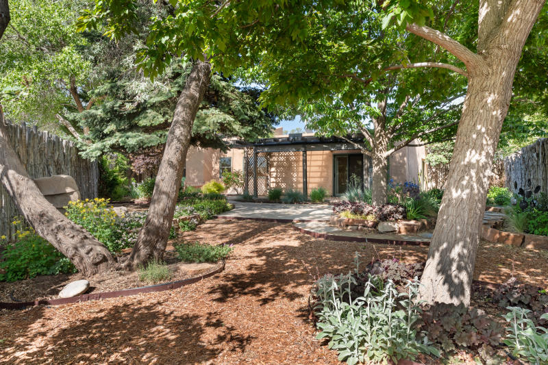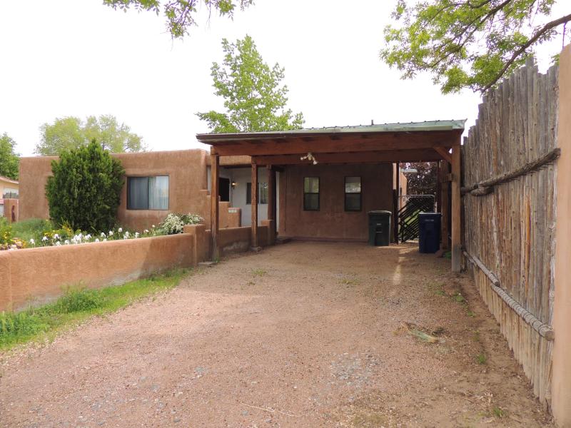 SOLD!: Simply Sweet, free-standing condominium located in the heart and soul of Downtown Santa Fe. This circa 1940s era Adobe property has many delightful touches including: Hand carved columns inside and out, rounded doorways, traditional low pitched roof, many colorful and original decorative features, and wood-framed windows - all add a touch of "Old Santa Fe" Grandeur to the living spaces. Two spacious bedrooms with walk-in closets, 1 has access to a private, South-facing courtyard; one full bath and detached garage for two cars and storage. A short pathway leads to the gated, enclosed garden where a fountain and pretty landscaping welcome guests to the front door which is framed by beautiful hand carved column. Walk, stroll, bike, or wheel to nearby Canyon Rd and environs. Newer roof, electrical, sewer line and more - all completed in recent years.