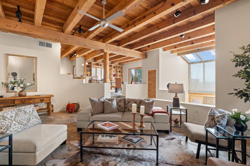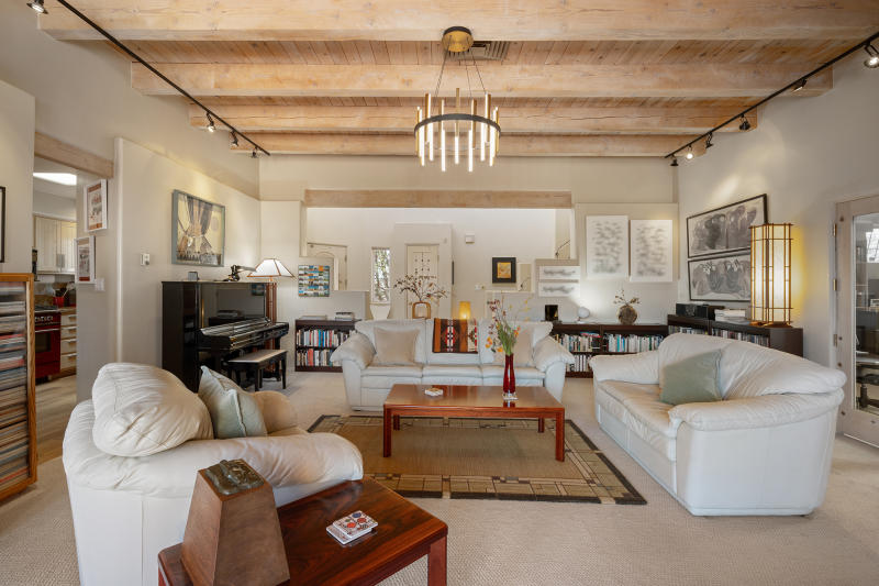 SOLD: In Town, Northside: A classic Santa Fe home nestled in the hills behind the Governor's Mansion, just minutes from the Historic Santa Fe Plaza. Classic 1970s era home on almost 2 acres in the Center of Downtown. NEW roof, NEW windows, NEW septic, NEW cooling (central forced), NEW heating, NEW electrical panel, NEW main gas and water line to the street, NEW driveway-completely regraded and graveled + more. Clerestory windows add all day natural light to the spacious dining room and a sunken, main living area has gorgeous high ceilings awash with light and warmed in the Winter months by a soaring, stone faced fireplace - creating a charming mid-century vibe. MLS 202401714 $1,095,000.00
