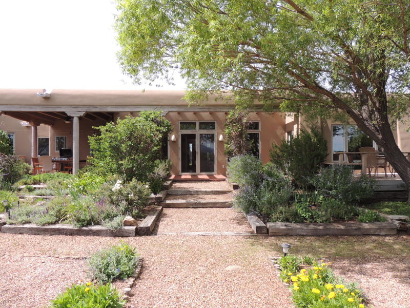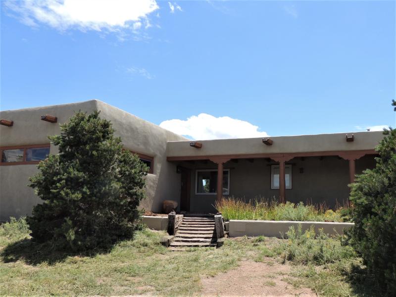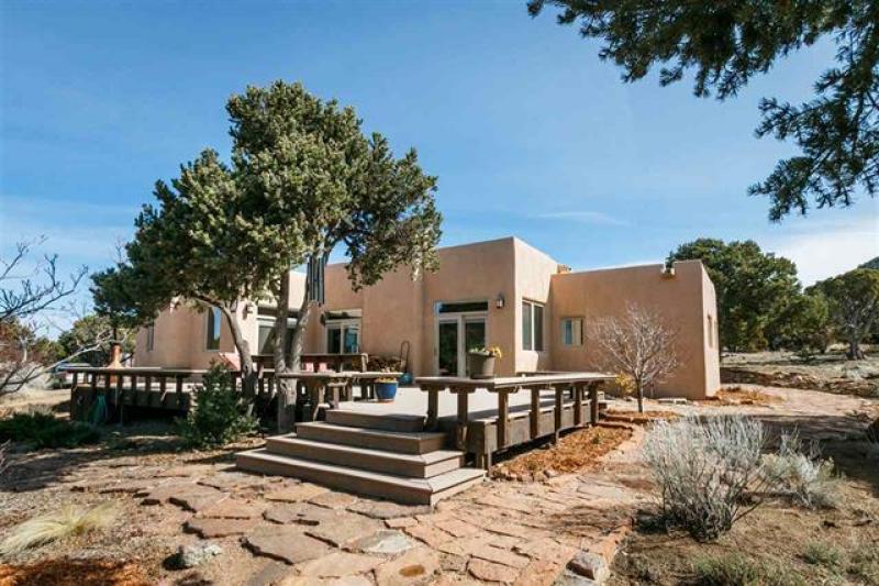 SOLD! Lovely property on the edge of town, just off Old Santa Fe Trail. Tucked down a short lane, the house boasts incredible views of the Jemez Mountains and nearby hillsides, fully fenced-in grounds, and beautiful landscaping. Multi-level layout, open living area has large windows, vigas & split cedar ceilings, french doors open to a large view deck and the landscaped patio.
