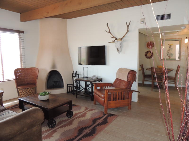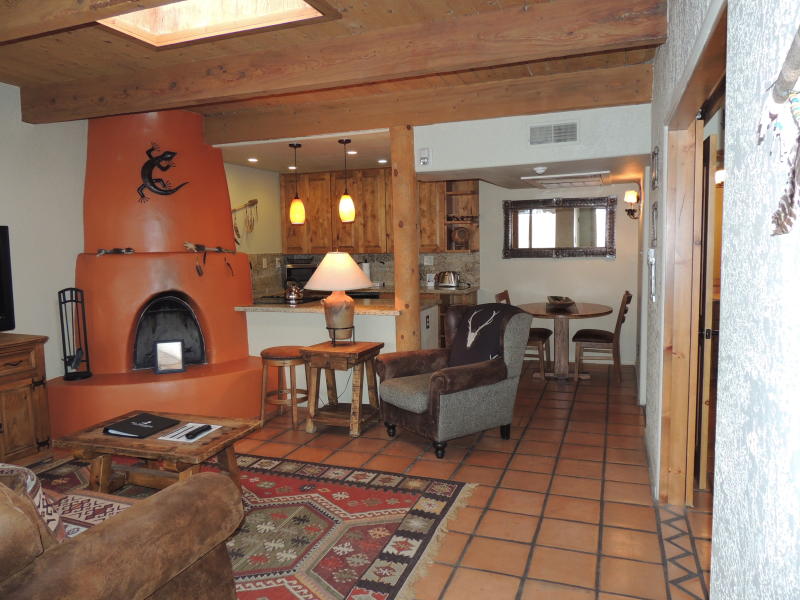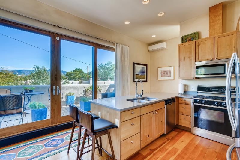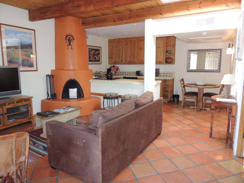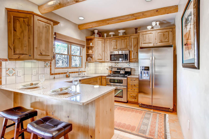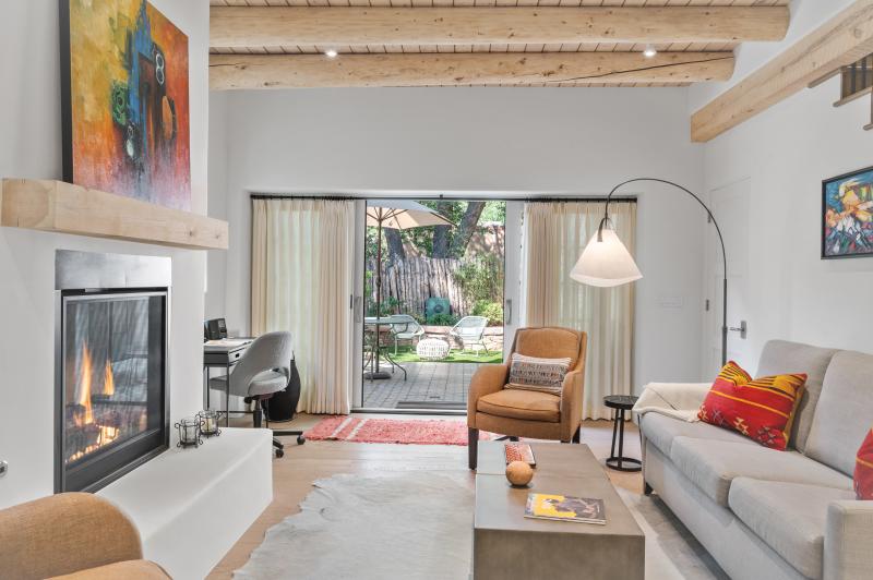 Santa Fe Style Abounds in this cute 1 bedroom condo located within a short walk/ride/stride of the Historic Plaza. Completely remodeled, kiva fireplace, full kitchen, sleek modern finishes, refrigerated AC. Custom built solid wood doors, extra large cabinets, high end furniture, and open floorplan add to the welcoming atmosphere and easy use of the space.