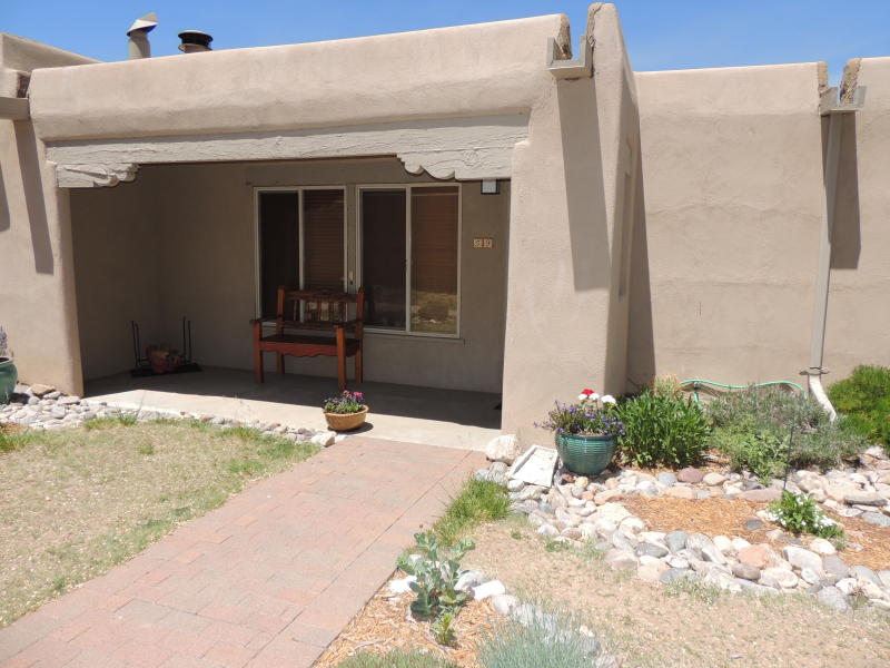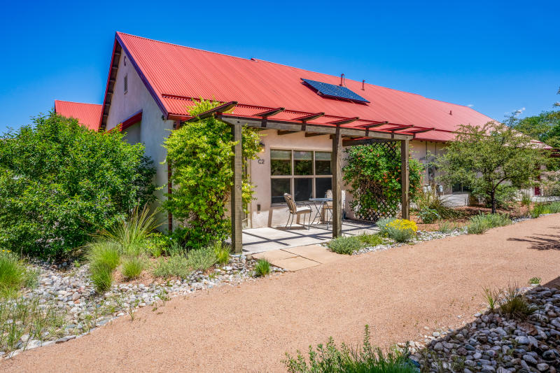 SOLD!: Cohousing Condo in Central Santa Fe. Are you the sort of individual who craves instant Community where you live? Sand River is a well established Cohousing Community for people Ages 55 + located right here in Santa Fe. Surrounded by LUSH landscaping (thanks to an extensive water catchment system) this delightful End Unit: Own Solar PV system, open concept kitchen, living, and dining area, one large bedroom, separate office/guest space with ample built ins, large full bath, and a capacious Storage.