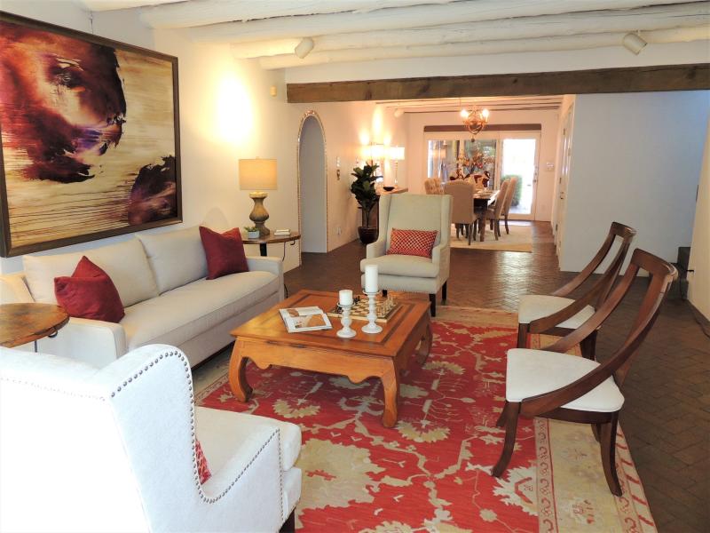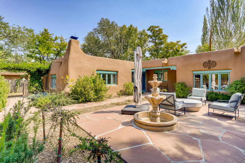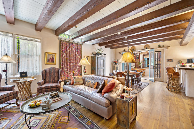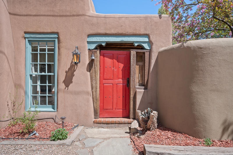 SOLD -Luxury Listing-Classic Eastside Adobe! Glorious Eastside Santa Fe Adobe home with modern additions located in the heart of it all: A short distance to Canyon Road, this lovingly cared for and updated Santa Fe original is on the market for the first time in nearly 40 years. The 1940s era, Northern NM style home include: Three bedrooms, three and a half baths, in-floor radiant heat, and a fourth "flex" room that can host guests, an office, or other use. An open dining, kitchen, and living areas are all located on street level and open to a cozy sunroom. Meander up a delightfully carved stairwell to a primary bedroom suite to admire: Spacious bedroom, two walk in closets, and two bathrooms. Main level has two bedrooms, a 3/4 bath and powder room, with access to a private, spacious, bricked courtyard. Decorative features such as carved beams, talavera tile accents, plaster walls, hardwood and tile flooring (much original to the house), and a pair of refurbished light fixtures from the Alamo in Texas. Property is fully enclosed, with gated driveway, and has access to the Acequia when running. Classic Santa Fe Features! $1,599,000.00 MLS#202102956