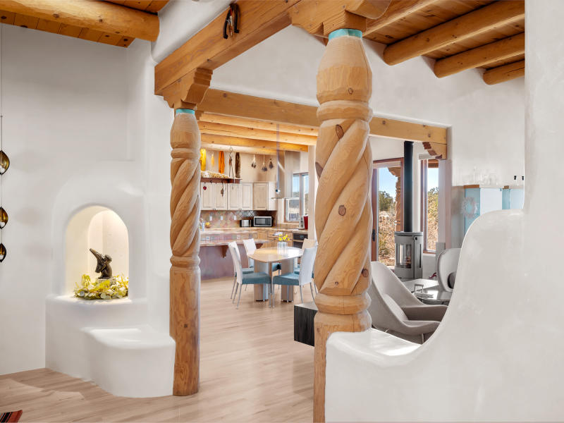 In the original co-housing community The Commons on the Alameda, this beautiful residence has many Santa Fe style features including beams, hand troweled plastered walls, and substantial pumice-crete construction giving sensuous curves and angles to every room. Natural light abounds inside and a private patio offers a quiet, enclosed garden space for entertaining and relaxing. Three bedrooms, separate dining/living rooms along with a designated office space.