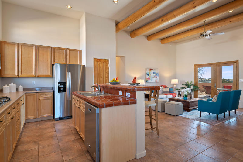 With custom solid wood doors (8ft tall), warm colored vigas & beams, in floor radiant heat, high ceilings, oversized windows, three bedrooms, and recent upgrades such as gleaming Quartz countertops (kitchen/baths), new plumbing fixtures, all tile flooring, and sensible AC Ductless cooling/heating (4 units), this house is easy to call HOME. The property boasts fabulous, unobstructed VIEWS to the N/NE and S/SW of Santa Fe's mountains, nearby hillsides, and Sunrises & Sunsets. The attached RV garage could be used as fitness room, storage, Artist Studio, or for some other creative use $895,000.00 MLS#202200204