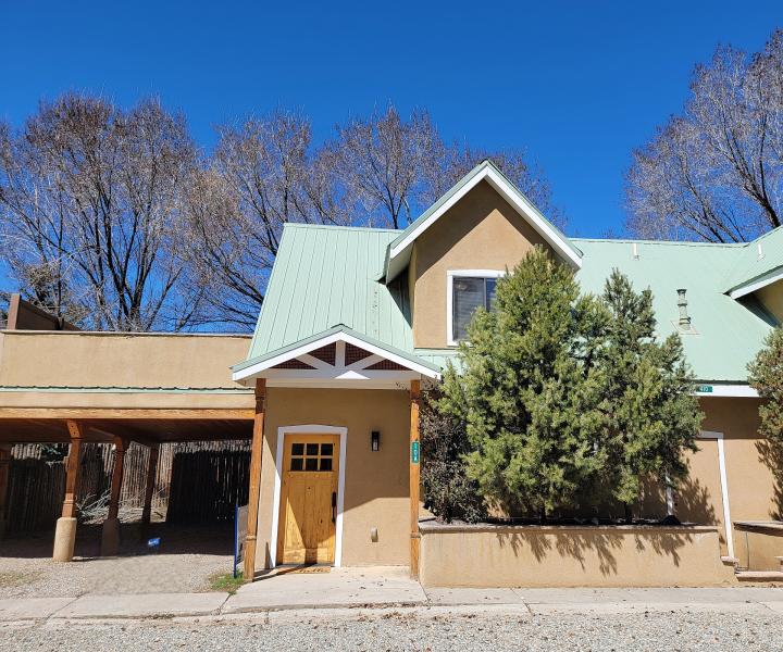 SOLD!: Super darling condo located in the heart of Downtown Taos NM! This small compound is made up of sweet, Northern NM pitched roof condominiums that offer modern amenities, beautifully landscaped spaces, carports, and that "mountain" feel in the middle of town. Two bedrooms, two baths (1 full, one 3/4 bath), open kitchen/living/dining. Plenty of storage. New gas range and oven (March 2024), 6 month new stackable washer and dryer, slate tile and hardwood flooring. Private deck off the upstairs primary suite.